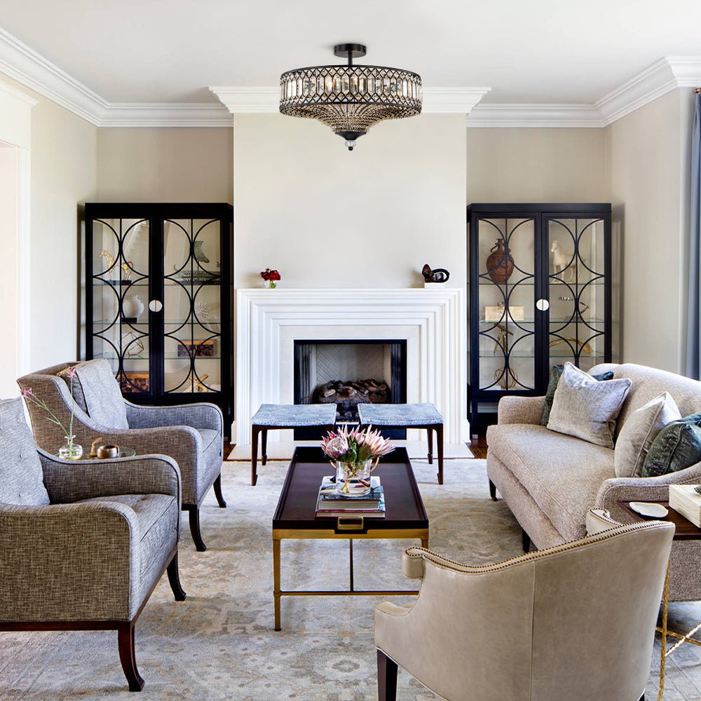 Lampa sufitowa montowana na krótkim wsporniku, składająca się z szerokiego, cylindrycznego klosza złożonego z licznych pionowych, przezroczystych elementów. Pod kloszem znajduje się konstrukcja w formie stopniowo zwężających się pierścieni z gęsto ułożonymi, małymi elementami przypominającymi kryształki. Dolna część lampy zakończona jest ozdobnym elementem w formie kulistego detalu. Obudowa ma jednolite wykończenie w ciemnym kolorze.