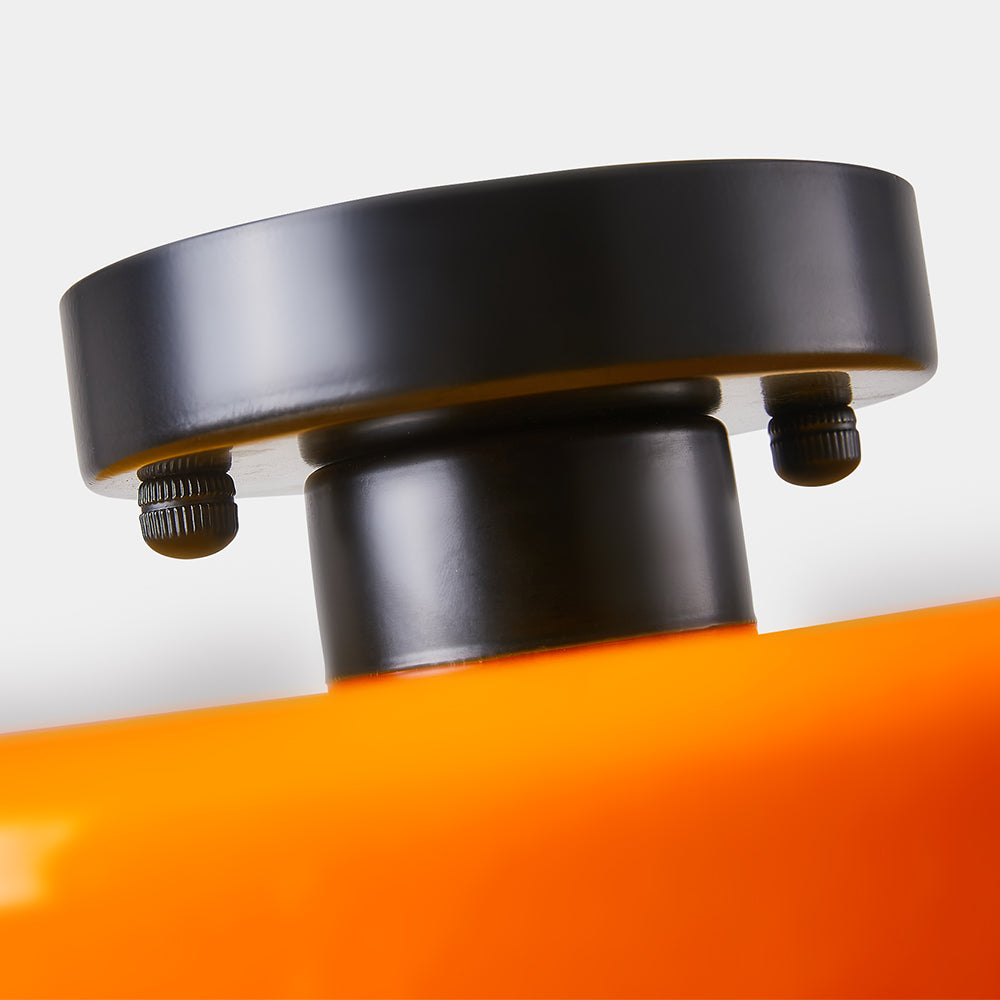 Lampa sufitowa z płaskim, okrągłym kloszem umieszczonym pod kompaktową podstawą montażową. Klosz ma gładką, błyszczącą powierzchnię i jednolity kolor. Źródło światła znajduje się centralnie pod kloszem i pozostaje w pełni widoczne. Podstawa montażowa posiada cylindryczne łączenie mocujące klosz do płytki sufitowej.