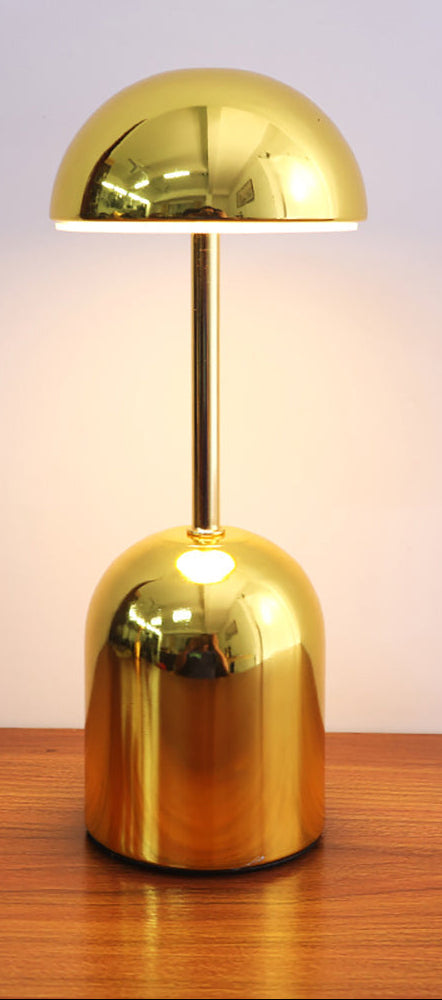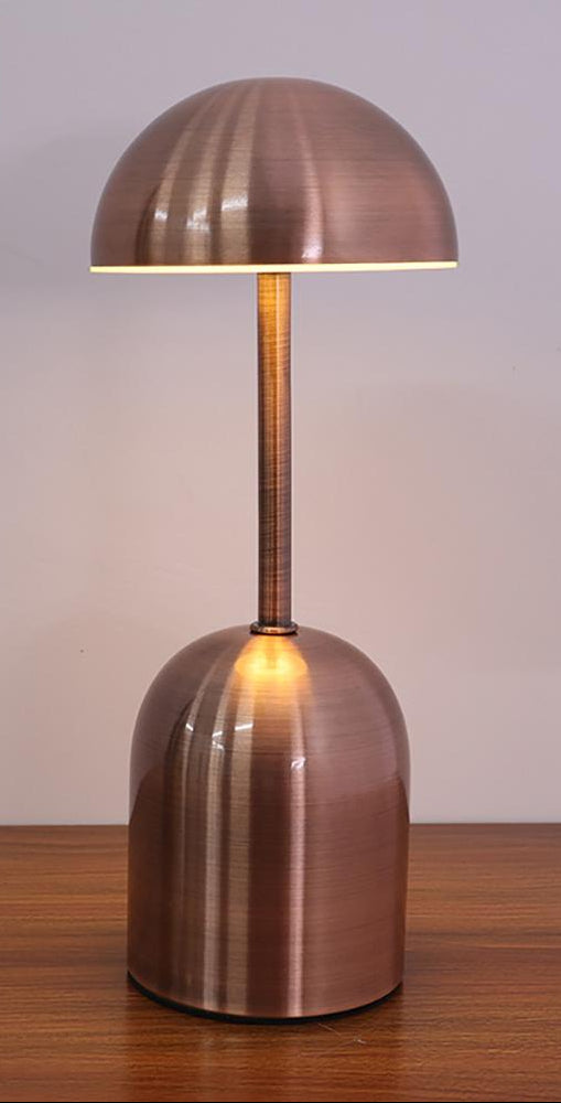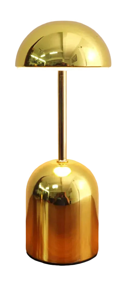 Lampka posiada smukłą, pionową konstrukcję z półkulistym kloszem osadzonym na cienkim trzpieniu. Podstawa ma zaokrąglony kształt i jednolitą metaliczną powierzchnię. Na boku podstawy widoczny jest pojedynczy przycisk sterujący. Całość utrzymana jest w spójnej kolorystyce i gładkim wykończeniu.