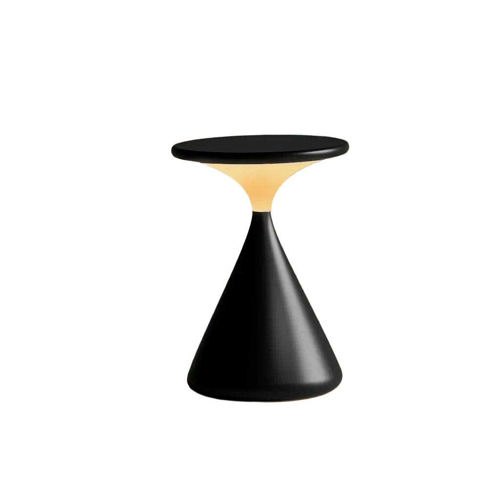 Lampka ma dwuczęściową konstrukcję zwężającą się ku środkowi, nadającą jej formę przypominającą klepsydrę. Dolna część to gładka, stożkowa podstawa o matowej powierzchni. Górny element ma płaski, okrągły kształt i tworzy z podstawą wizualną całość poprzez łączący je jasny, podświetlany środkowy fragment. Światło emitowane jest równomiernie pod górną częścią, tworząc miękkie, rozproszone oświetlenie.