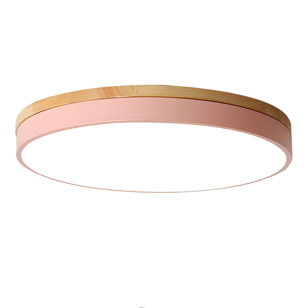 Lampa sufitowa o szerokiej, okrągłej konstrukcji montowanej bezpośrednio przy suficie. Centralny panel świetlny tworzy jednolitą, matową powierzchnię. Wokół panelu znajduje się gładki pierścień w ciemnym kolorze, a nad nim wąski pasek w jaśniejszym odcieniu. Całość ma prostą i jednolitą formę bez dodatkowych detali.